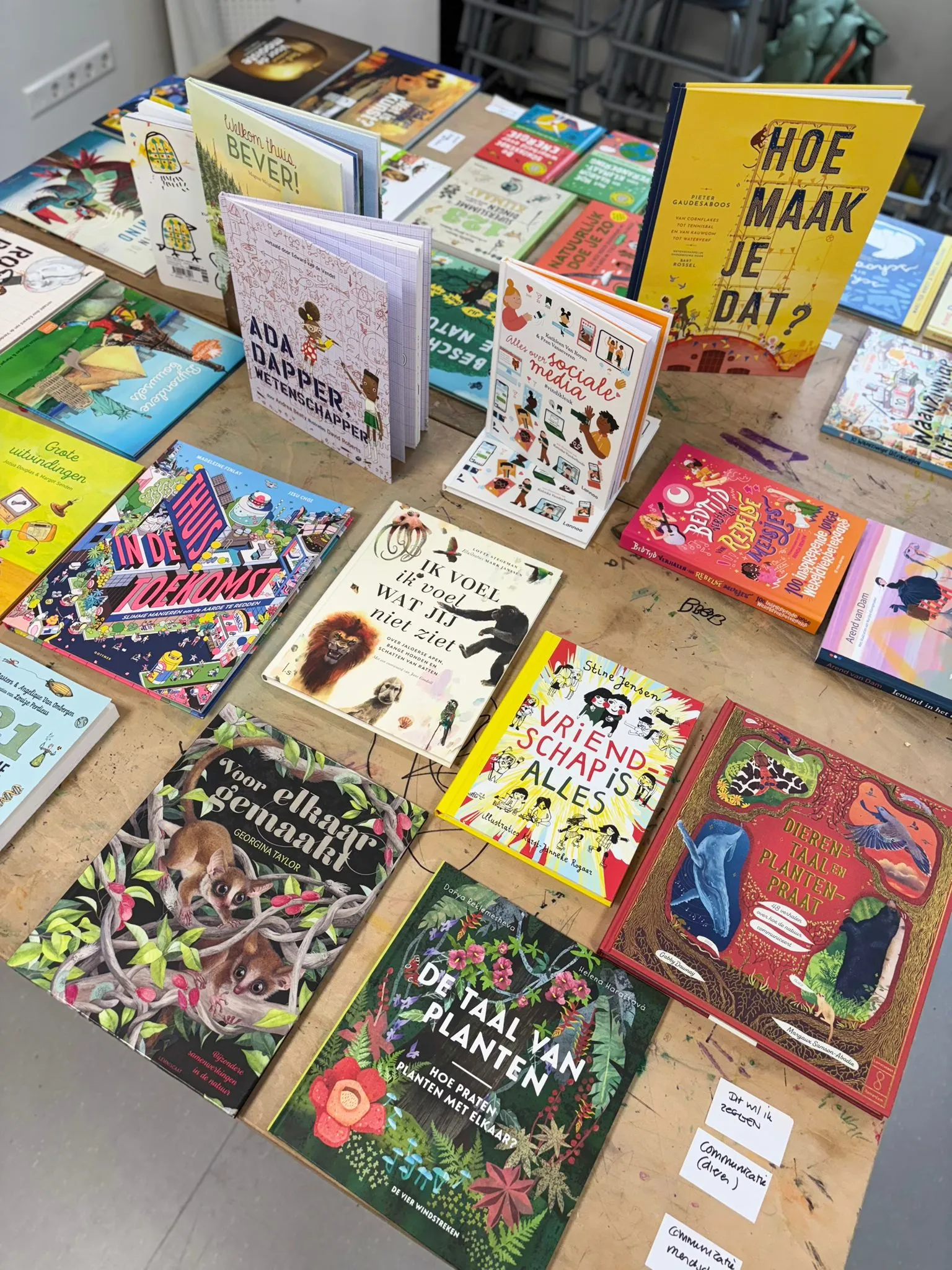 ‘Wie wil weten waarom je voetafdruk groter is dan je schoenmaat moet dit boek lezen!’ Een juf hield het gelijknamige boek van schrijvers Esther Walraven en Wilfried Ivens omhoog. Onderling werden nog meer tips uitgewisseld. Titels die zeker weten een plek binnen de school moesten krijgen, zoals De zweetvoetenman van Annet Huizing en Het dikke boek van onze bijzondere aarde van Cally Oldershaw. Sommigen vonden het perfecte boek voor een specifieke leerling, terwijl anderen de boeken het liefst zelf eerst wilden lezen. Aan het eind van de ochtend waren de tafels leeg en de armen van de leerkrachten gevuld met stapels nieuwe boeken. Voldaan verliet iedereen het lokaal, klaar om de verhalen en kennis te delen met hun leerlingen.